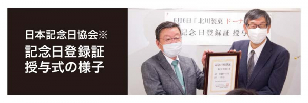 ドーナツ製造開始より60周年の節目を記念して、多くのお客様に当社製品をご愛顧頂いた事への感謝の気持ちと、これからもおいしいドーナツの製造が続けられるようにとの願いを込めて、毎年6月6日を『北川製菓ドーナツの日』として記念日登録を行いました。