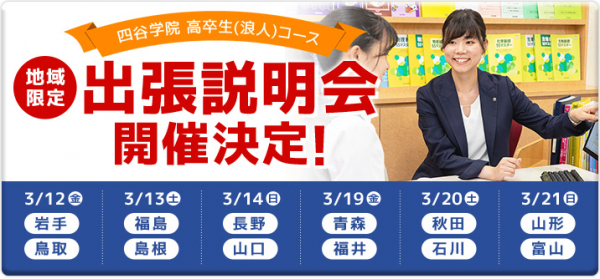 独自の「ダブル教育」システムによる、きめ細かい指導が特長の四谷学院(経営母体:ブレーンバンク株式会社、本社:東京都新宿区、代表取締役:植野 治彦)は、2021年3月より全国12カ所で出張説明会(無料)を開催します。