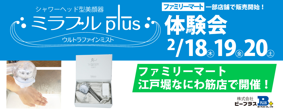株式会社ビープラスが販売代理店を務める株式会社サイエンスのシャワーヘッド『ミラブルplus』の無料体験会を「ファミリーマート江戸堀なにわ筋店」にて、2021年2月18日(木)~20日(土)の期間に開催いたします。