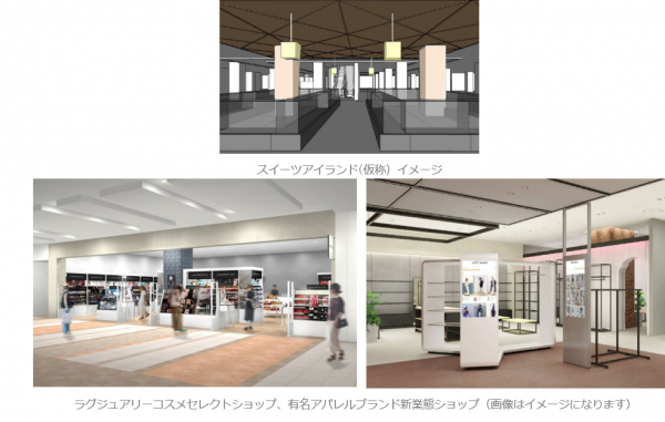 ベースフロアとなる1階・2階においては多彩な店舗を集積します。有名アパレルブランドのデジタルとリアルを融合した新業態店舗や、和装、シューズ、インナー、バッグ、アクセサリー雑貨、メガネ、美容室など幅広いラインナップの店舗が並びます。また、ラグジュアリーコスメのセレクトショップが出店し、従来、高級化粧品をお買い求めされていたお客様のニーズにお応えできるように致します。