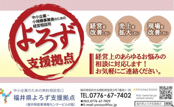 福井県よろず支援拠点は、国が設置する中小企業・小規模事業者・創業希望者等のための経営相談窓口です。各士業のほか、デザインやWEB制作、料理家など幅広い分野の専門家を配置し、事業承継前後の経営体制の強化や新商品開発・新規事業への取り組みなど、経営の様々な課題解決に対応します。対面の相談だけでなく、zoomなどを使ったオンライン相談も可能です。「無料で」「何度でも」ご利用いただけますので、お気軽にご連絡ください。