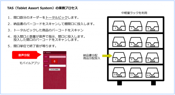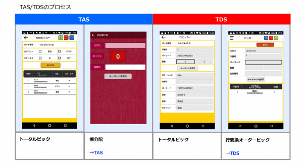 クラウドWMS「エアロジ」は、荷主ごとのオーダーを分析して、最適なバッチグループに自動分割する特許技術を有しており、物流倉庫から人気の仕組みとなっていますが、エアロジでマルチ注文のみでD(Different)バッチにまとめて、それをTAS分配する間口数などにさらに分割してバッチ番号を付与して、トータルピッキングする機能がありますが、その後工程にモバイルマテハンを利用するとデータ連携してすぐに利用が可能となります。