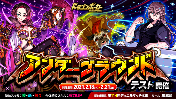 株式会社アソビズム(本社:東京都千代田区、代表取締役:大手智之)は、App Store・Google Playにて好評配信中のリアルタイム合体カードバトル『ドラゴンポーカー』で、2021年2月18日(木)より「アンダーグラウンド」をテスト開催いたします。
