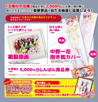 さらに「らしんばん秋葉原店新館」限定のダブルチャンスとして、「五等分の花嫁プレゼントキャンペーン」の応募券発行と同時に「俺の嫁くじ」にも挑戦いただけます。