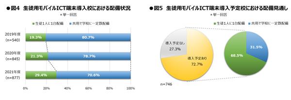 生徒用モバイルICT端末の導入校に対して配備状況の内訳を調べたところ、「生徒1人1台配備」と答えた高等学校の割合は29.4%となりました〈図4〉。 回答校を国公立校・私立校に分類して見てみると、「生徒1人1台配備」の割合は、国公立校で14.2%・私立校で53.4%と、現状では配備傾向に差が生じています。