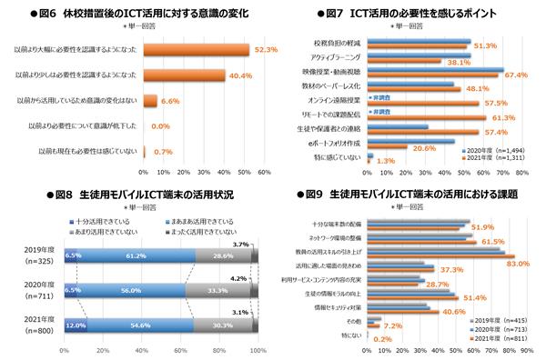 具体的にどのようなことにICTの必要性を感じたかという調査では、「映像授業・動画視聴」(67.4%)が昨年に引き続き最多でしたが、「リモートでの課題配信」(61.3%)、「オンライン遠隔授業」(57.5%)、「生徒や保護者への連絡」(57.4%)といった、休校により需要が生じた項目についても高い回答率となりました〈図7〉。 実際に高等学校からは、「休校中の課題配信によって授業の遅れを防げた」とICT活用の効果を評価する声や、「休校中の運用で教員のICTスキルが向上し、登校が再開された現在でも有効活用されている」と、休校の前後でICT活用の実態が変化したという声も上がっています。