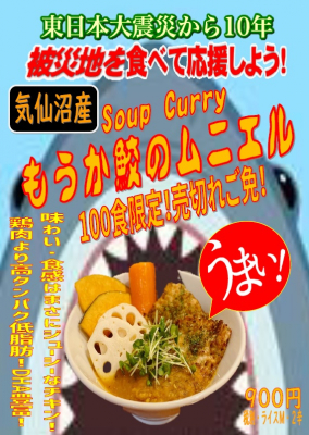 もうか鮫のムニエルのスープカレーを、「東日本大震災10年【食べて】復興支援メニュー」として900円(税別)で提供します。鮫の肉は、肉質が淡白、ふわっとした食感、味、どれもがスープカレー定番の鶏肉に似ています。魚特有のDHAやEPAだけでなく、鉄分が豊富であることも鮫肉の特徴です。