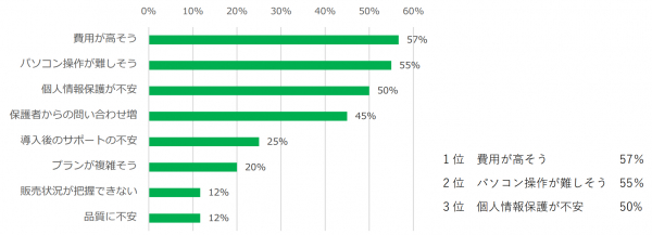 ・同サービスの導入に対し、「費用・パソコン操作・個人情報の保護」に関して、導入園の約半数が不安等を感じていたことがわかった。