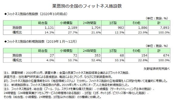 全国のフィットネス施設経営企業および施設を対象として調査したところ、2020年10月時点での全国フィットネス施設数は7,893施設であった。また、施設を業態別に分類すると、総合型1,131施設、小規模型2,189施設、24時間型1,704施設、ヨガ型983施設、その他1,886施設になった。サーキットトレーニング主体である小規模型のフィトネス施設数が最も多く全体の27.7%を占めており、近年、急速に施設数が増えている24時間型の施設は、現時点では小規模型に次ぐ21.6%であった。一方で、従来主流であった、プール、ジム、スタジオを兼ね備えた総合型は14.3%にとどまっている。