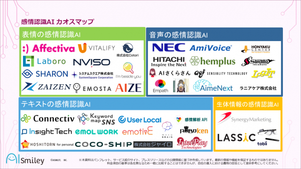 人工知能を搭載したサービスの資料請求ができるAIポータルメディア「AIsmiley」を運営するアイスマイリー(東京都渋谷区、代表取締役:板羽晃司)は、感情認識AIをまとめた「感情認識AIカオスマップ」を2021年2月25日に公開します。掲載数は合計40サービス。