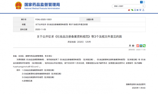 化粧品登録及び登記資料に関する規範(意見募集第2稿)2020年11月4日公表