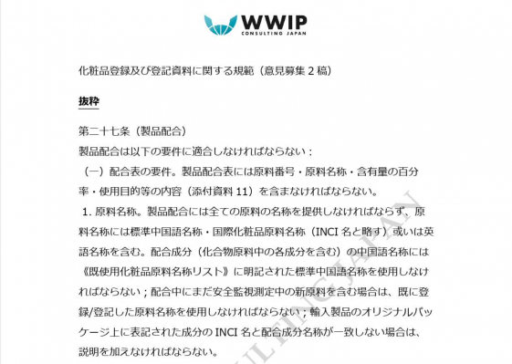 ワールドワイド・アイピー・コンサルティングジャパン(WWIP)は、これまで31年ぶりの全面改訂となった中国国家薬品監督管理局(NMPA)が公告した、新「化粧品監督管理条例」(2021年1月1日施行)、並びに関連の実務条例の詳細を報告して参りました。