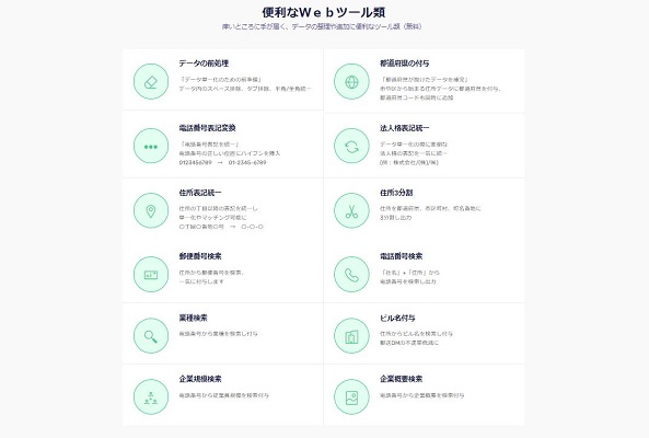 データマーケティングに便利な道具箱「D-tools(ディーツールズ)」は無料かつ登録不要ですぐに使えるWebツール群から構成されます。マーケティングのデジタル化に伴い発生する面倒なリストデータの整理・加工・追加等の作業を解消でき、生産性の向上に寄与します。
