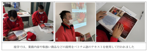 配属初日である2月10日は入社オリエンテーションを実施し、初めに、ベトナム語に翻訳した挨拶文章を配布したうえで社長の加藤元のよりオンラインでの歓迎挨拶を行いました。その後、同じくベトナムから来日し当社に入社した社員2名が作成したベトナム語のテキストを使用し、業務内容や取扱う商品概要などを座学で学びました。