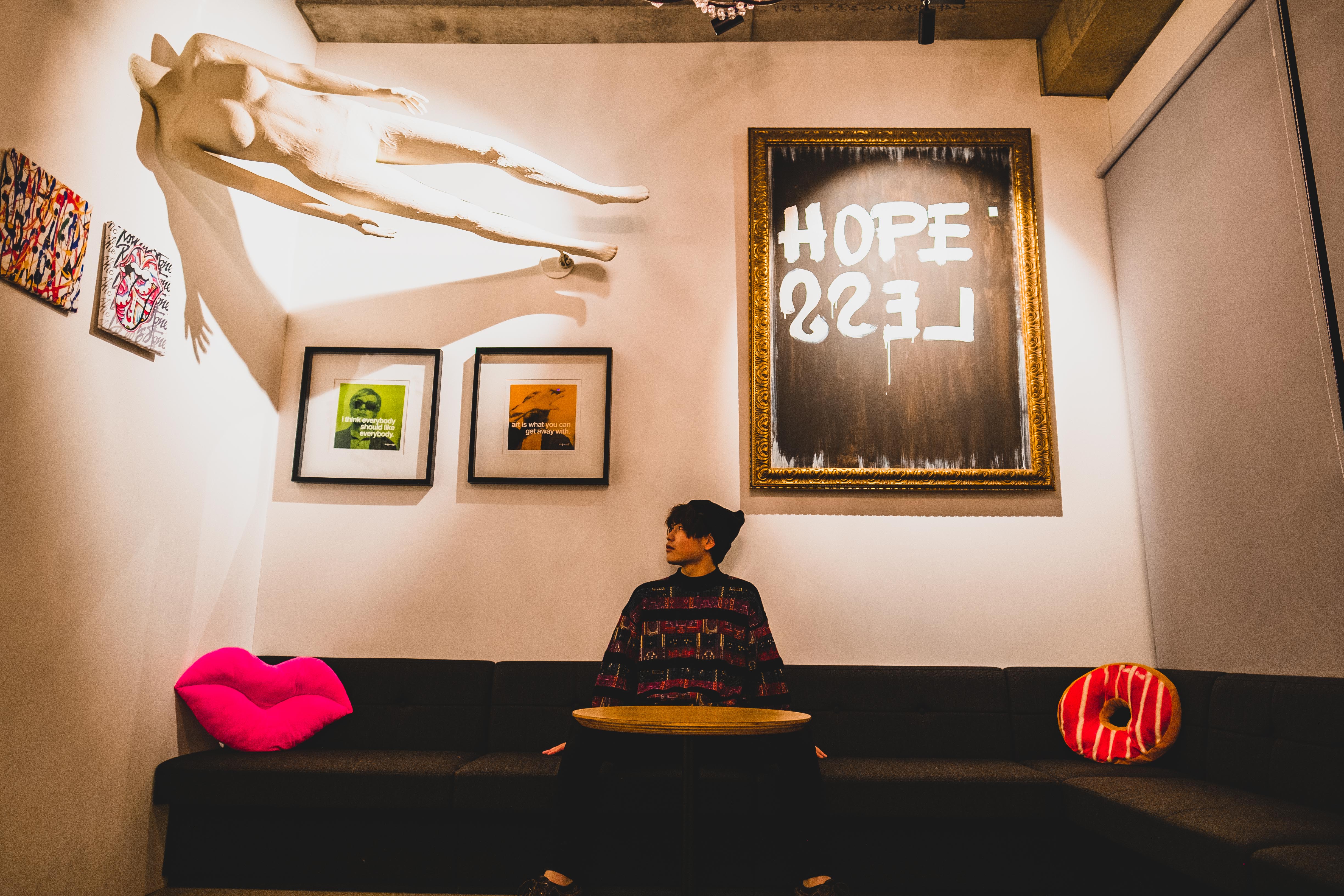 レセプション、エレベーターホールの壁のペイントアート、複数階にある共有ラウンジの絵画やオブジェなど、館内全体に、モダンで個性的なアート作品が点在しています。