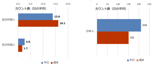 平日と週末の利用傾向の分析結果を見てみると、訪日外国人では平日よりも週末が多く、在日外国人では逆に、週末よりも平日のほうが多く、これは、日本人の傾向と似ています。