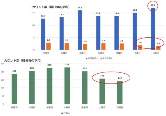 次に、曜日別の分析結果を見てみると、在日外国人は日本人とほぼ同じように、平日に多く週末には少なくなる傾向を示しますが、訪日外国人は日曜日に最も多い傾向を示します。これは観光目的の人流に特徴的な傾向です。