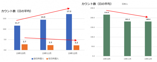 さらに、月別の推移を見てみると、10月から12月にかけて、訪日外国人では増加の傾向となっていますが、在日外国人は日本人とほぼ同様に減少しています。