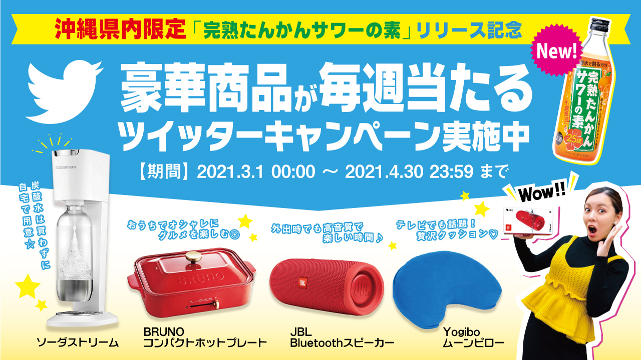 久米仙酒造株式会社(本社:沖縄県那覇市、代表取締役:比嘉洋一)は、2021年2月1日より販売開始した『完熟たんかんサワーの素』の新発売を記念して豪華賞品が毎週当たるツイッターキャンペーンを2021年3月1日(月)よりスタートしました。