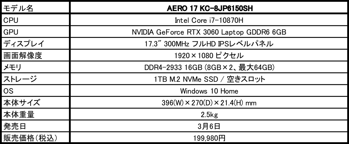 2021年3月5日 - GIGABYTE Technology Co., Ltd. 台湾・新北市 - コンピュータテクノロジーで世界をリードするGIGABYTE Technologyは、GPUにNVIDIA GeForce RTX 3060モバイル版を採用し、ディスプレイに300Hz駆動という高リフレッシュレートの17.3型フルHDパネルを搭載したクリエイター向けノートPC「AERO 17 KC-8JP6150SH」をAmazon.co.jpを通じて3月6日より販売いたします。販売価格(税込)は199,980円です。