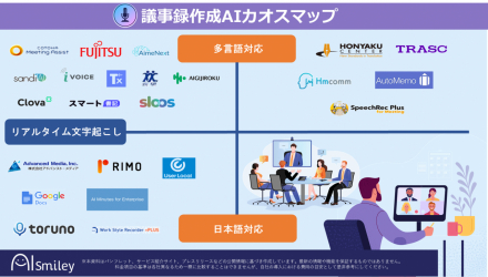 ※このカオスマップは議事録作成AIを提供している企業のプレスリリースや製品サイト、導入実績などの公開情報を基にAIsmiley編集部が独自の主点で取りまとめたもので、網羅性や正確性を完全に担保するものではありません。
