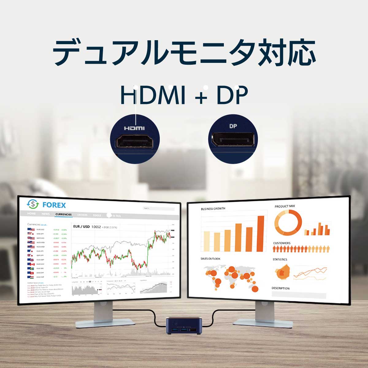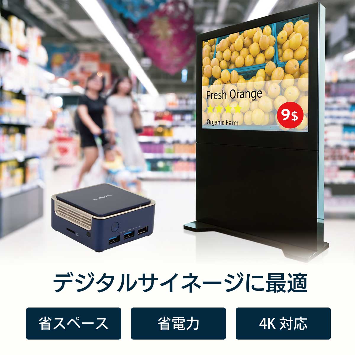 4K/60fpsの出力に対応する、HDMI 2.0、DP1.2ポートを搭載しデュアルディスプレイをサポートします。フルHDの4倍となる高解像度を60fps(秒間フレームレート)で出力することで、滑らかで自然な映像として出力できるため、デジタルサイネージなどに最適です。