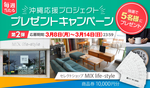 沖縄発のインターネットベンチャーである琉球インタラクティブ株式会社(本社:沖縄県宜野湾市、代表取締役社長:臼井 隆秀、以下「琉球インタラクティブ」)は、沖縄県民と旅行者のための沖縄お出かけ情報サイト「おきなわLikes」で、抽選で5名様にMIX life-style(ミックス ライフスタイル)の商品券1万円が当たる“沖縄応援プロジェクト!プレゼントキャンペーン第2弾”を2021年3月8日(月)から開催します。