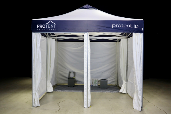コンパクトに収納でき専用キャリーケースで持ち運びも容易なことから、必要なタイミングに必要な場所(屋内外を問わず)ですぐに利用できます。組み立てには特別な工具も必要なく、少人数・短時間で設置が可能です。以下、URLでテントの組み立ての様子をご紹介しています。