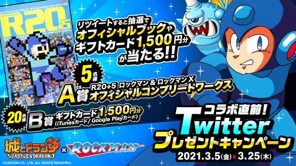『城とドラゴン』公式Twitterアカウントをフォローし、対象ツイートをリツイートしていただいた方の中から抽選で、『ロックマン』のオフィシャルブック、ギフトカード1,500円分をプレゼントいたします。