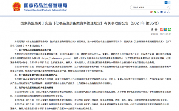 ・ 2021年5月1日から化粧品登録者、登記者、国内責任者は、特殊化粧品登録或いは普通化粧品登記は、新登録登記ラットフォームを通じて申請する必要がある。
