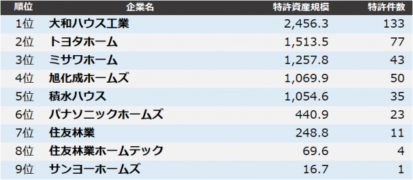 株式会社パテント・リザルトは3月11日、独自に分類したハウスメーカー業界の企業を対象に、該当全9社が保有する特許資産を質と量の両面から総合評価した「ハウスメーカー 特許資産規模ランキング2020」をまとめました。2019年4月1日から2020年3月末までの1年間に日本特許庁が登録した特許を対象に、個別特許の注目度を得点化する「パテントスコア」を用いた評価を行い、企業ごとに総合得点を集計しました。