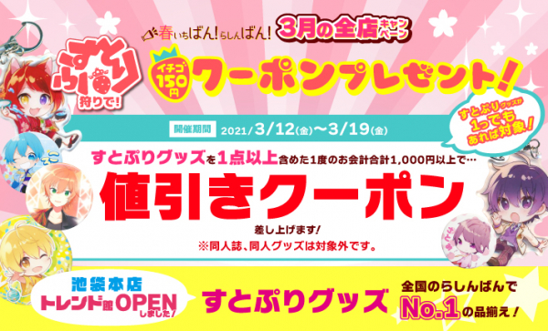 2021年3月12日(金)~3月19日(金)の期間中、『すとぷり』関連商品を1点以上含めて一度に1,000円(税込)以上お買い上げいただいた方に、150円分の値引きクーポンをプレゼントいたします。