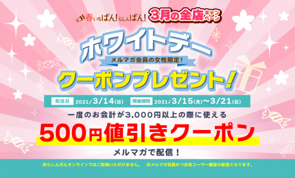 ホワイトデーとなる2021年3月14日(日)に、らしんばんのメールマガジンにご登録いただいている女性のお客様限定で、ホワイトデークーポンをプレゼントいたします。