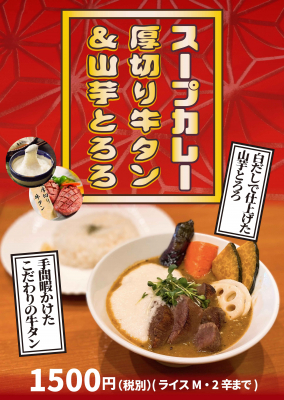有限会社マジカルエッグ(本社:東京都足立区)が運営する東京・墨田区で唯一のスープカレー専門店「お江戸スープカレーちゃはや庵」(所在地:東京都墨田区)は3月20日(土・祝)、2021年2月に限定メニューとして販売した「スープカレー・厚切り牛タン&山芋とろろ」をレギュラーメニューとして新発売します。先月、3日間だけのバレンタインデー企画の特別メニューとして販売したところ、大変な人気であったことからレギュラー化。価格は1,500円(税別)です。