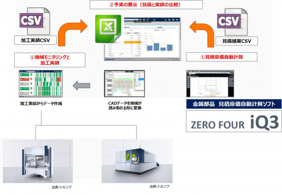 今回の連動で、加工機に蓄積された実績情報をもとに見積計算ができるようになり、“予想原価と実績の差が限りなく少ない見積”を瞬時に計算することができる、業界初(※)の加工機とモニタリングシステムを介して見積原価自動計算ソフトの連動となります。(※当社調べ)