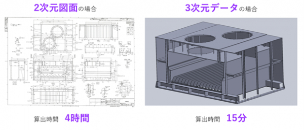 当社ではいち早く3次元データへの対応を考え、瞬時に見積り結果が出るソフトウエアを開発しています。「iQシリーズ」は、3次元を2次元に変換することができることが特徴であり、2次元化したデータから見積計算を行います。3次元データで400部品を超える機材の見積書を作る場合、熟練の職人がしっかり計算して3日かかる見積も、当社の見積ソフトを使用するとキーボード数回をたたくだけで40分あれば自動で正確な見積が完成します。