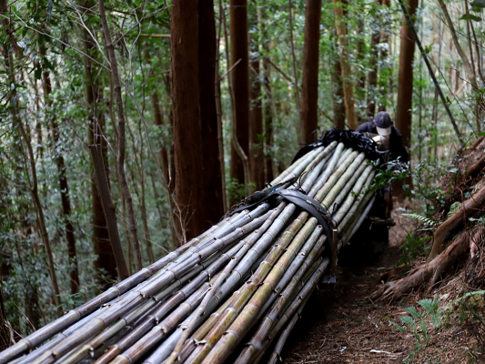 その虎竹は、晩秋から1月下旬までが伐採のシーズンです。竹は品質維持のため旬の良い時だけに伐採するため、この時期に1年分の材料が山から運び出されます。熟練の山の職人が細く険しい山道を登り、足場の悪い竹林で一本、一本伐りだす虎竹。今回は他では見ることのできない虎竹の里の山出し作業の様子をご紹介します。