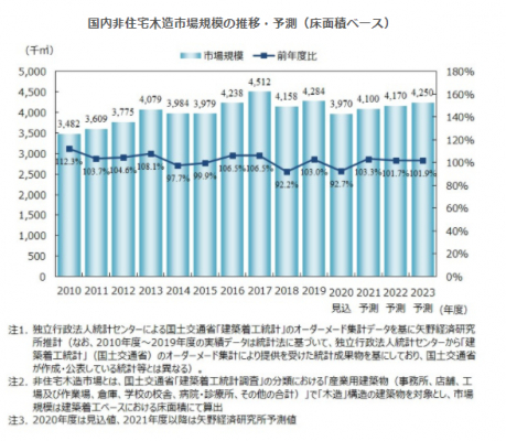 大規模建築物(3,000平方メートル以上)の着工動向は非住宅木造市場全体に大きく影響する。2021年度は2020年度に新型コロナウイルス感染拡大の影響によって着工計画が先送りとなった大型物件などの需要のずれ込みによって一時的に数%程度の増加が期待される。