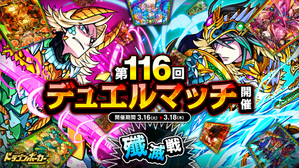 株式会社アソビズム(本社:東京都千代田区、代表取締役:大手智之)は、App Store・Google Playにて好評配信中のリアルタイム合体カードバトル『ドラゴンポーカー』で、2021年3月16日(火)より「第116回デュエルマッチ本戦」を開催いたします。
