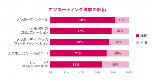2020年3月以降に転職したスキル人材のうち、53%の職場では入社手続き(書類)がデジタル化されていたことがわかりました。コロナ禍で転職した会社員の多くがリモートと対面を組み合わせたオンボーディング(新入社員研修)を経験した中で、全体の78%が「自身の職責・会社からの期待値を明確に理解できた」と回答。会社のカルチャー(企業文化)については、71%が理解を深められたと回答しました。オンボーディング全体への評価は高く、全体の82%が満足していることが分かったほか、項目別評価では76%が「上司・同僚とのコミュニケーション」に満足したと回答しました。