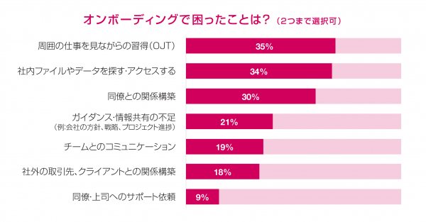 オンボーディング体験への総合評価は高かった一方で、会社の戦略・各種システムの使い方などを学ぶ「トレーニング」に対しては、3人に1人が不満を感じていたことが分かりました。また、パフォーマンスを十分に発揮するためのツール・リソースについても32%が「入社時に揃っていなかった」と回答しました。さらに、オンボーディング期間中に最も困ったことでは「周囲の仕事を見ながらの習得」(35%)、「社内ファイル/データを探す・アクセスすること」(34%)が上位に着けました。