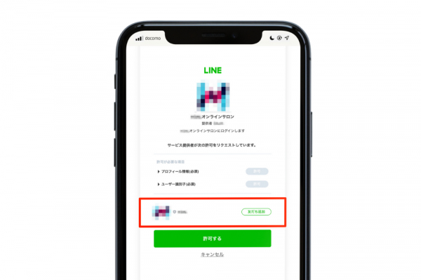 ・ソーシャルログイン(SNSのアカウントを用いてオンラインサロンに会員登録・ログインができる機能)の付帯機能として、ログイン時に自社LINE公式アカウントの友達追加リンク表示(プレス画像)