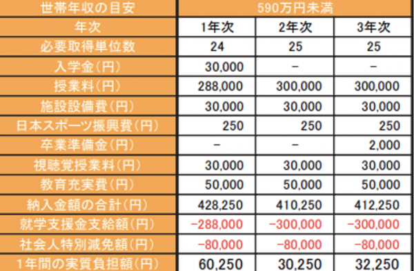 社会人特別減免は、社会人コース(20歳以上)の方は全員対象となり、毎年学費から80,000円を一律減免。非課税世帯の場合、初年度は入学金込で60,250円、2年次は30,250円、3年次は30,250円と、3年間にかかる学費は合計120,750円(スクーリング費、教材費別途)です。
