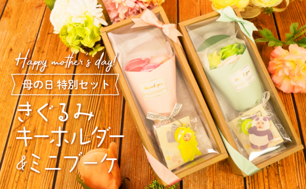 昨年も好評をいただいた「きぐるみキーホルダー」と「ミニブーケ」がセットになった母の日ギフトセットが今年も登場致します。