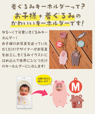 「きぐるみキーホルダー」とお子様の「顔写真」と「きぐるみデザイン」を組み合わせたオリジナルのアクリルキーホルダーです。