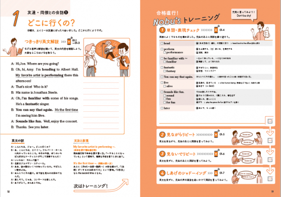 レッスンは1回あたり2ページ。対応する音声は約10分(準1級は15分)で、「英文→先生による丁寧な解説→聞いて声に出すトレーニング」という構成。音声を再生すれば、あとは音声の指示に従って、まるでNOBU先生がつきっきりで隣にいるような感覚で、レッスンを受けることができます。