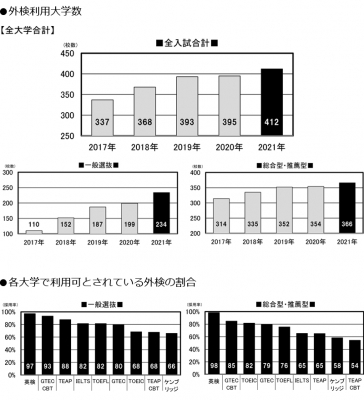 2021年から大学入試共通テストがスタートし、大学入試を取り巻く仕組みも大きく変わりました。成績提供システムが見送られるなど紆余曲折はありながらも、英語の外部検定(外検)を利用する大学は結局、2021年入試では昨年と比べ、一般選抜、総合型・推薦型ともに増加となりました。 また、大学入試において外検を利用する学科のうち、95%以上が「英検」を利用可としており、英検の取得は、大学受験生にとってますます重要度を増してくると考えられます。