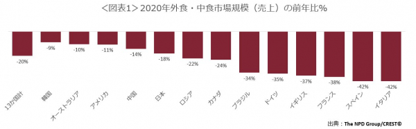 NPD Groupが世界13カ国で実施している、外食・中食市場情報サービス『CREST(R)』によると、新型コロナウイルス感染拡大の影響で、世界13か国(米国、カナダ、ブラジル、ロシア、フランス、ドイツ、イギリス、イタリア、スペイン、日本、中国、韓国、オーストラリア)における2020年の外食・中食市場の売上高は、1兆1,570米ドル(約123.8兆円)で、20%減でした。食機会数(客数)は、21%減でした。