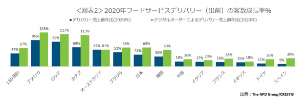 多くの国で強制的なロックダウンによってイートインの選択肢が制限された一方で、レストランに対する消費者の需要は衰えず、デジタル注文やデリバリーなどの中食に前例のない成長をもたらしました。デリバリーは、2020年の食機会数(客数)が47%増加して137億3000万件に達し、世界各国でシェアリングデリバリーサービスやプラットフォームが、急速に進歩しました。特に、米国、ロシア、カナダ、オーストラリアデリバリーの成長率が高くなりました。
