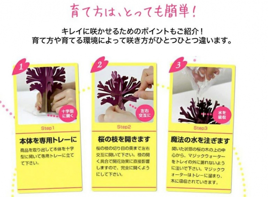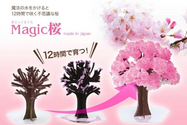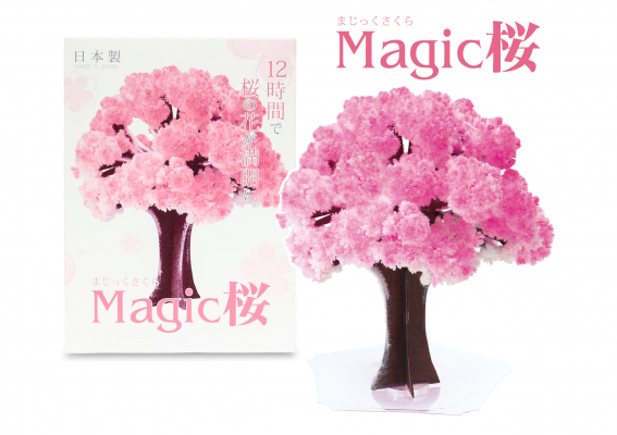 マジック桜は、紙で出来た木に魔法の水をかけるとわずか12時間で咲く手のひらサイズの不思議な桜です。